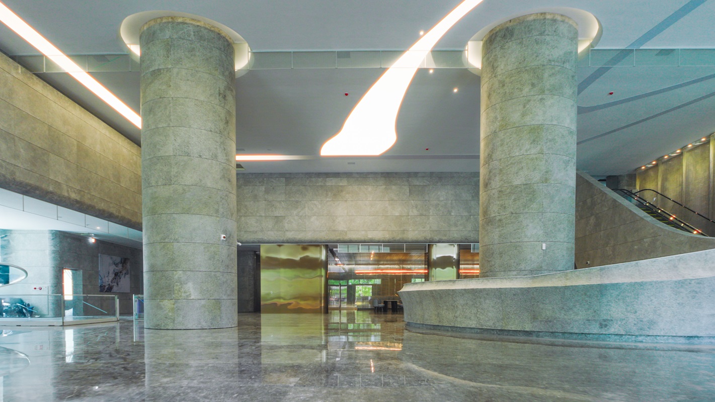 -天梯伏筆 境界更上一階- 延伸曲線空間語彙,1至2樓弧線石材精工壁面對比深色手扶梯,拾階人文思維的再進化。